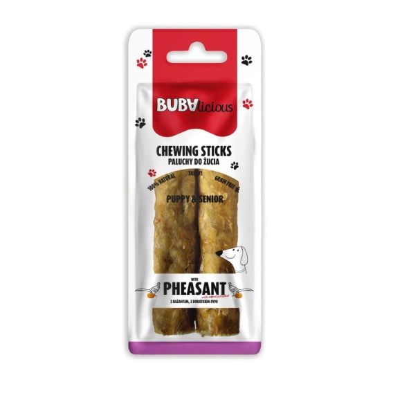 BUBAlicious Paluchy z bażantem to aromatyczne, twarde i w pełni naturalne gryzaki stworzone z myślą o codziennej potrzebie psa, jaką jest żucie. Żucie wspiera mechaniczne usuwanie płytki nazębnej i pomaga ograniczać powstawanie kamienia nazębnego, przyczyniając się do higieny jamy ustnej. To zdrowa, naturalna i smakowita przekąska.