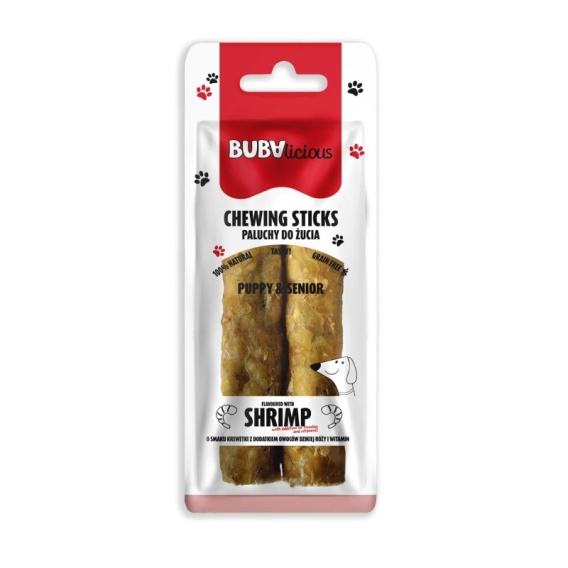 Smaczne paluchy do żucia ze skóry wołowej o smaku krewetki z dodatkiem owoców dzikiej róży i witamin. Produkt przeznaczony dla psów w każdym wieku, w tym szczeniąt i seniorów. Opakowanie zawiera dwa paluchy o długości 15 cm.
