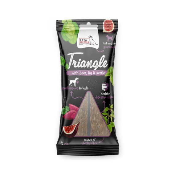 Trójkąt do żucia dla psa, dzięki naturalnej kompozycji składników takich jak: skóra z jelenia, owca suszona, królik suszony, batat, szpinak, proszek z zagęszczonego soku z ananasa, figa suszona, pokrzywa - która sprawiają, że ten przysmak jest wyjątkowy i wpływa na zdrowie i witalność Twojego psa. Każdy kęs to eksplozja smaków i wartości odżywczych dla Twojego pupila.